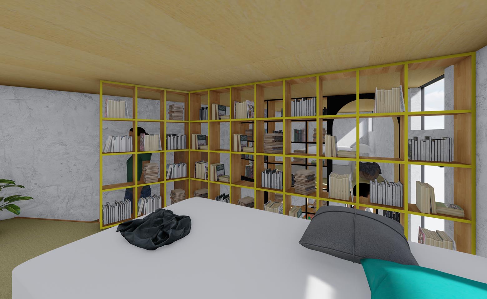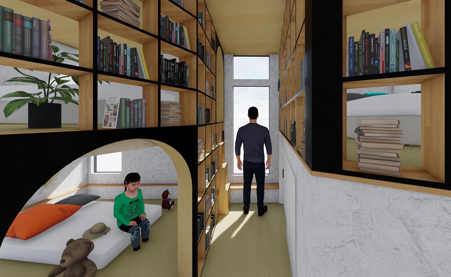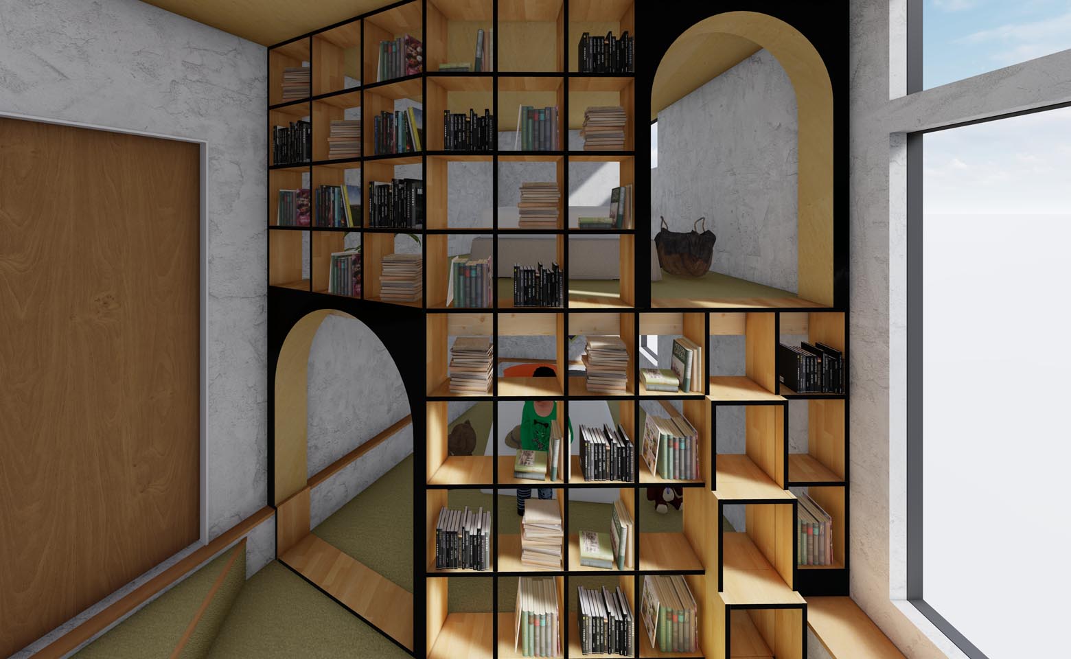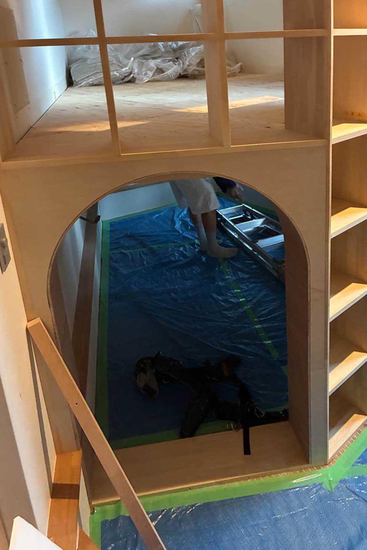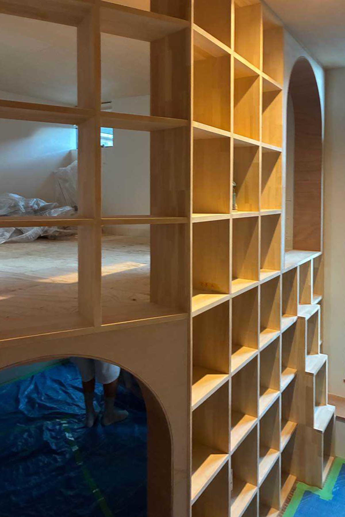子供部屋の入り口はアーチに。最終系は、こんな形に。本棚の中に部屋があるなんて素敵です。遊び心のある施主家族。