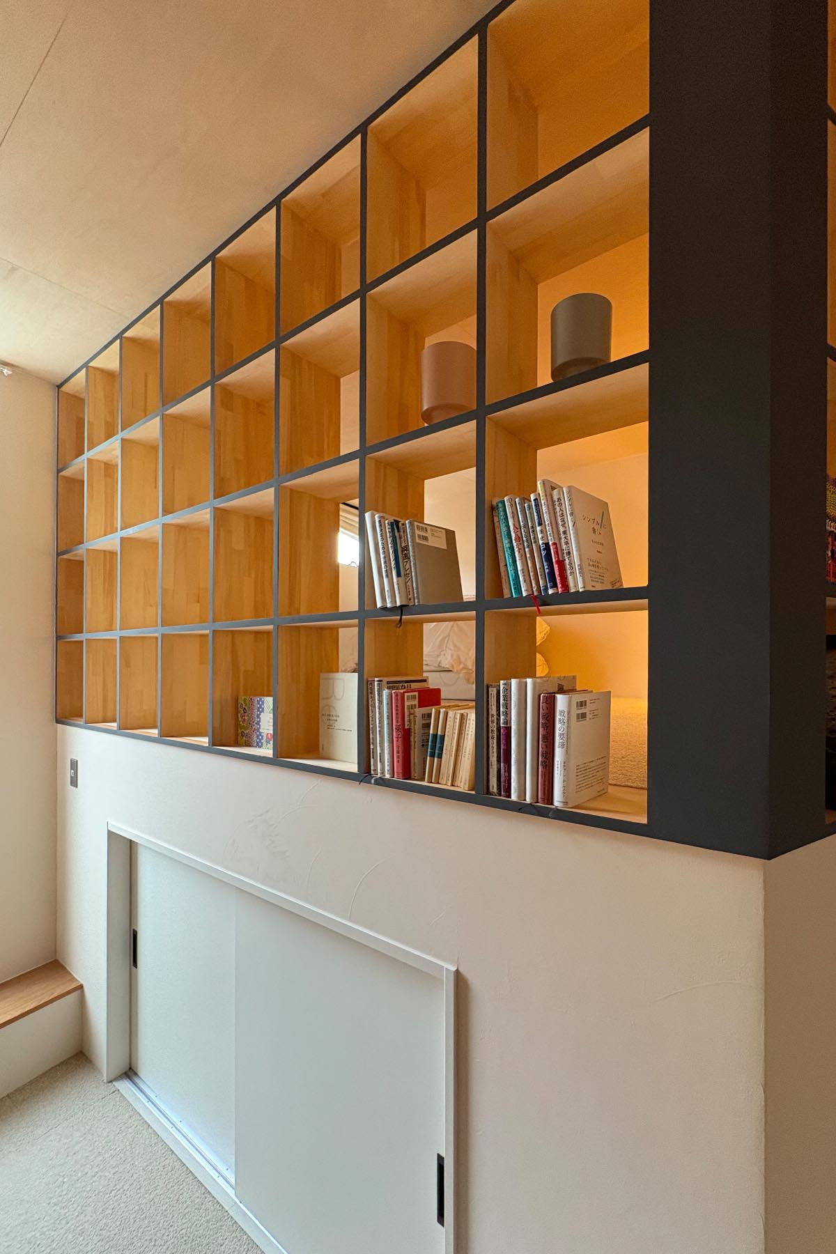 人が立つとこんな感じに。図書館のようです。木製の棚板の小口は塗装されており、アクセントになっています。