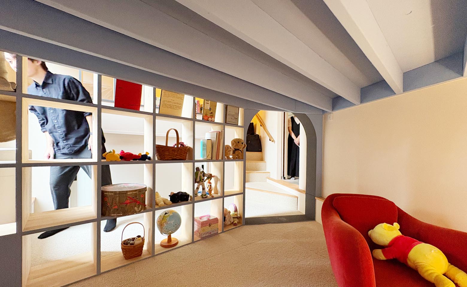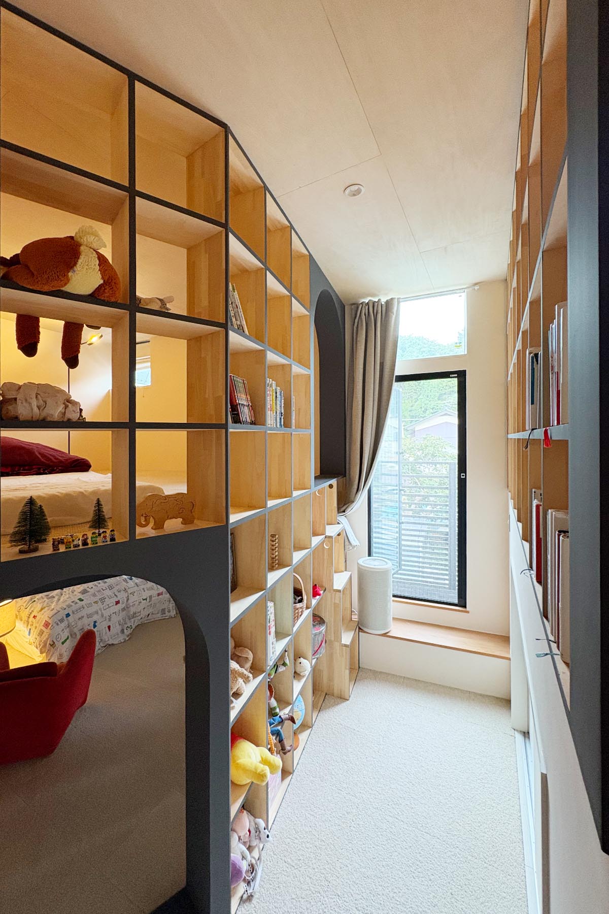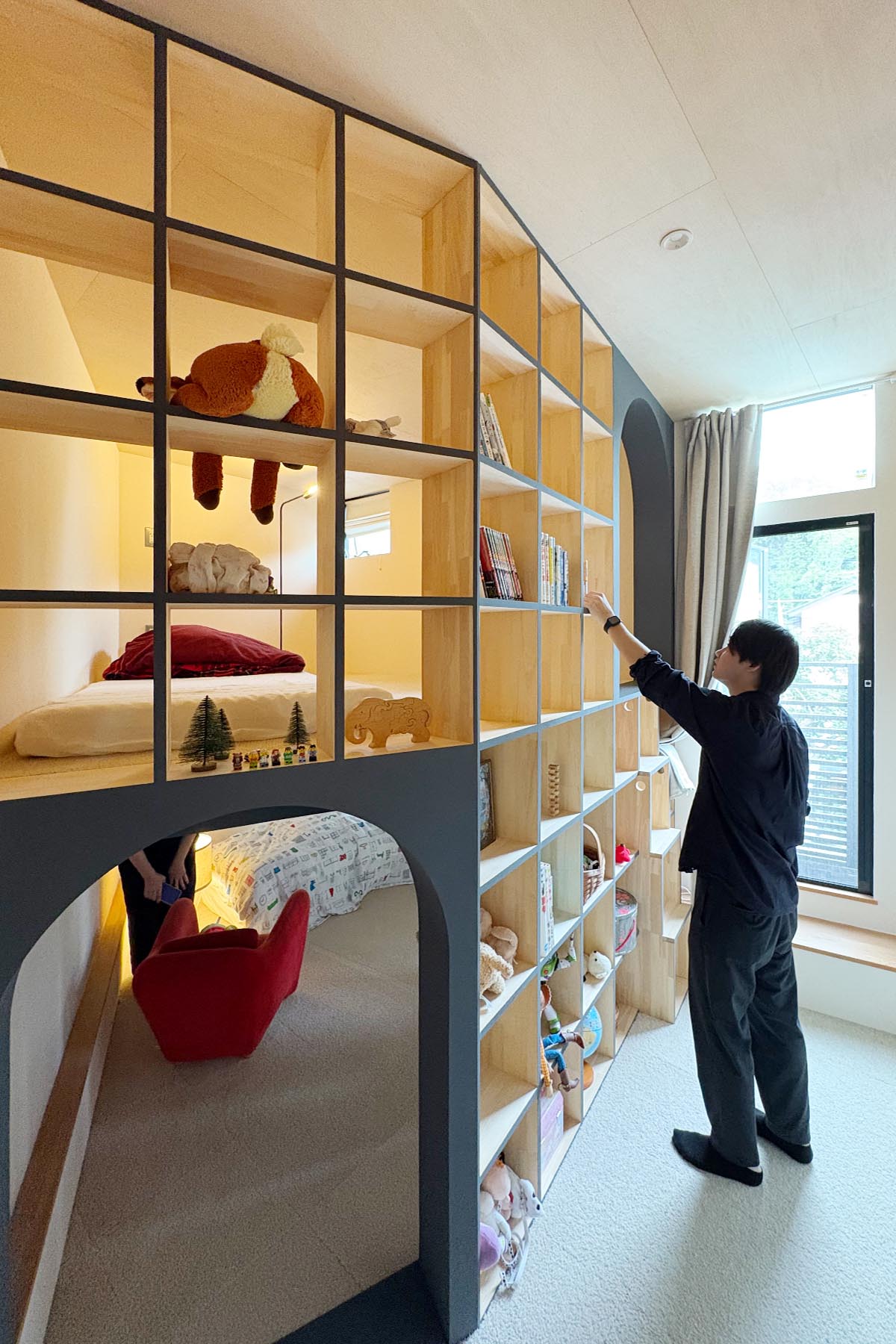 ただ、普通に壁でわけるのでは、つまらない、、ということで、施主ご家族の要望もあり、本棚で各部屋を分けることになりました。