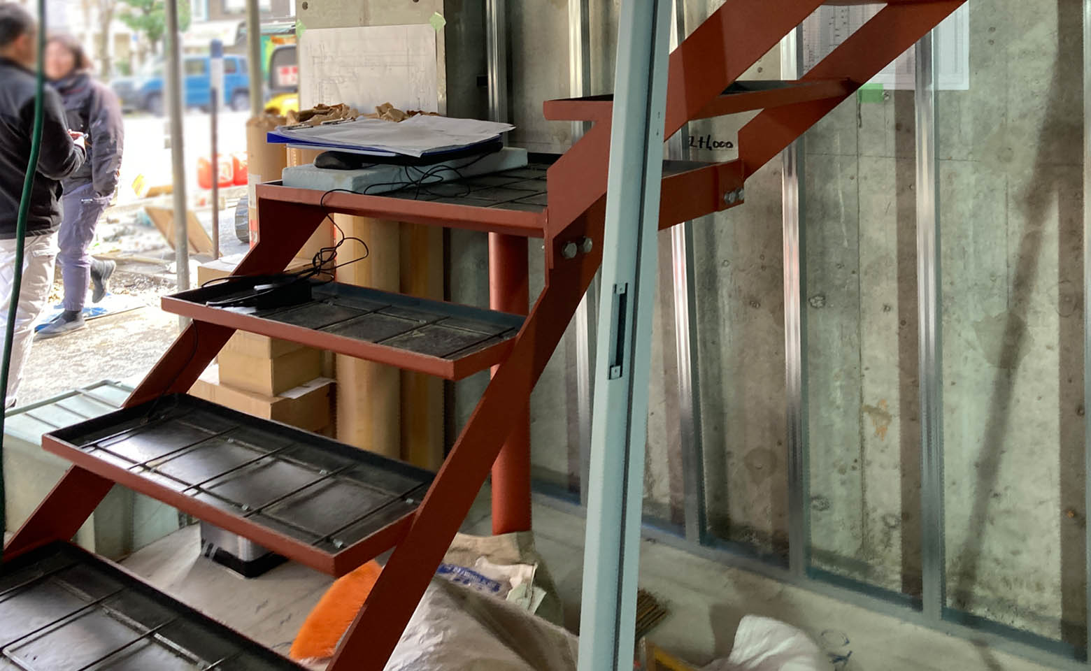 写真は鉄骨の階段。作図し製作図を調整して、現場へと搬入し設置されます。