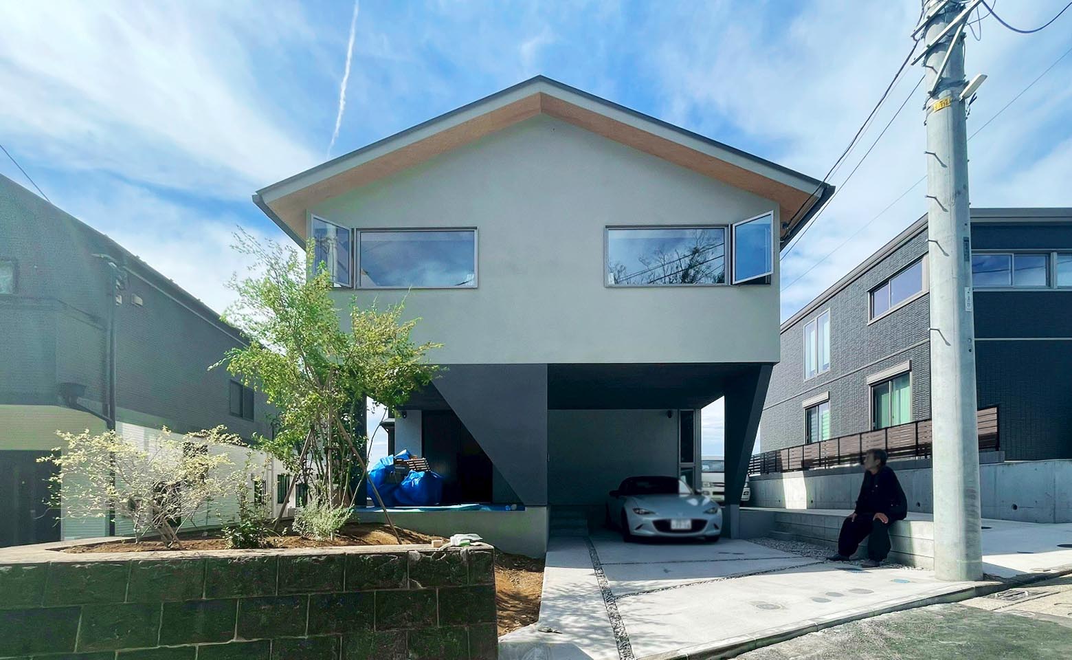 丘の上部に位置する土地は、隣地がお寺の森となっており、その緑地を借景とするように、居住空間を2Fへと持ち上げ、1Fを趣味の車や自転車をいじったりできる、ピロティ空間としている。