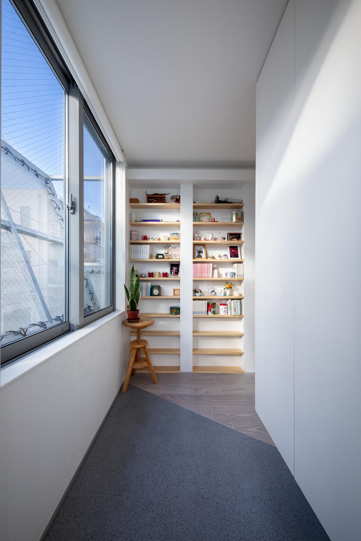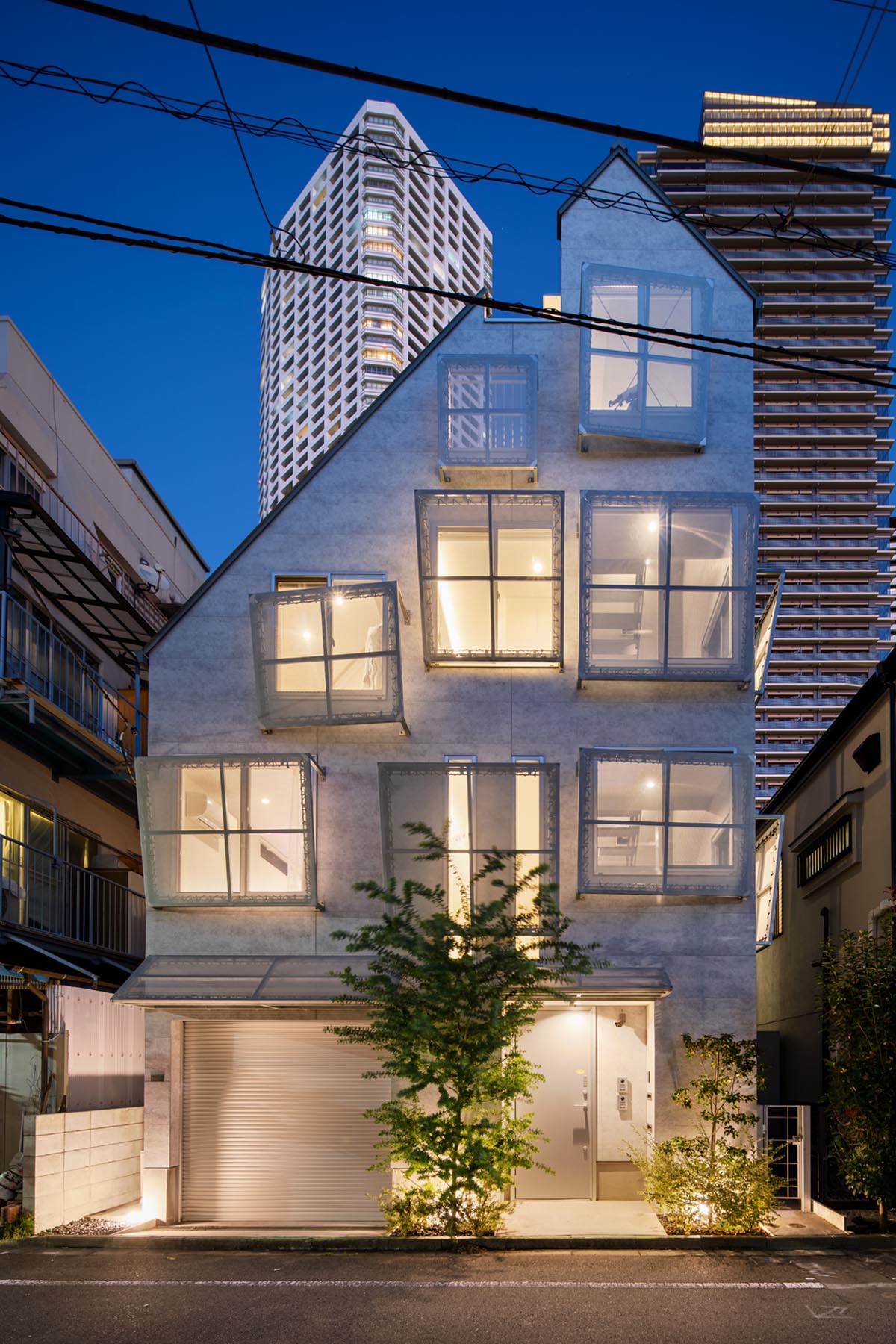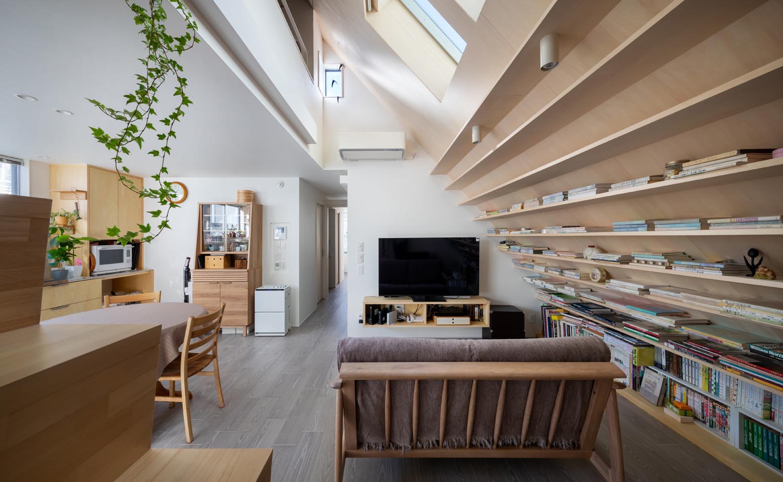 急こう配の屋根の下は、屋根裏部屋のような個室や、リビングの本棚となり、その急こう配の屋根が延長するように、屋上のペントハウスへとつないだ外観とした。周囲は事務所ビルも多く、3F以上の建物も多かったため、なるべく高さを出すことで周辺の建物に埋もれないように配慮した。