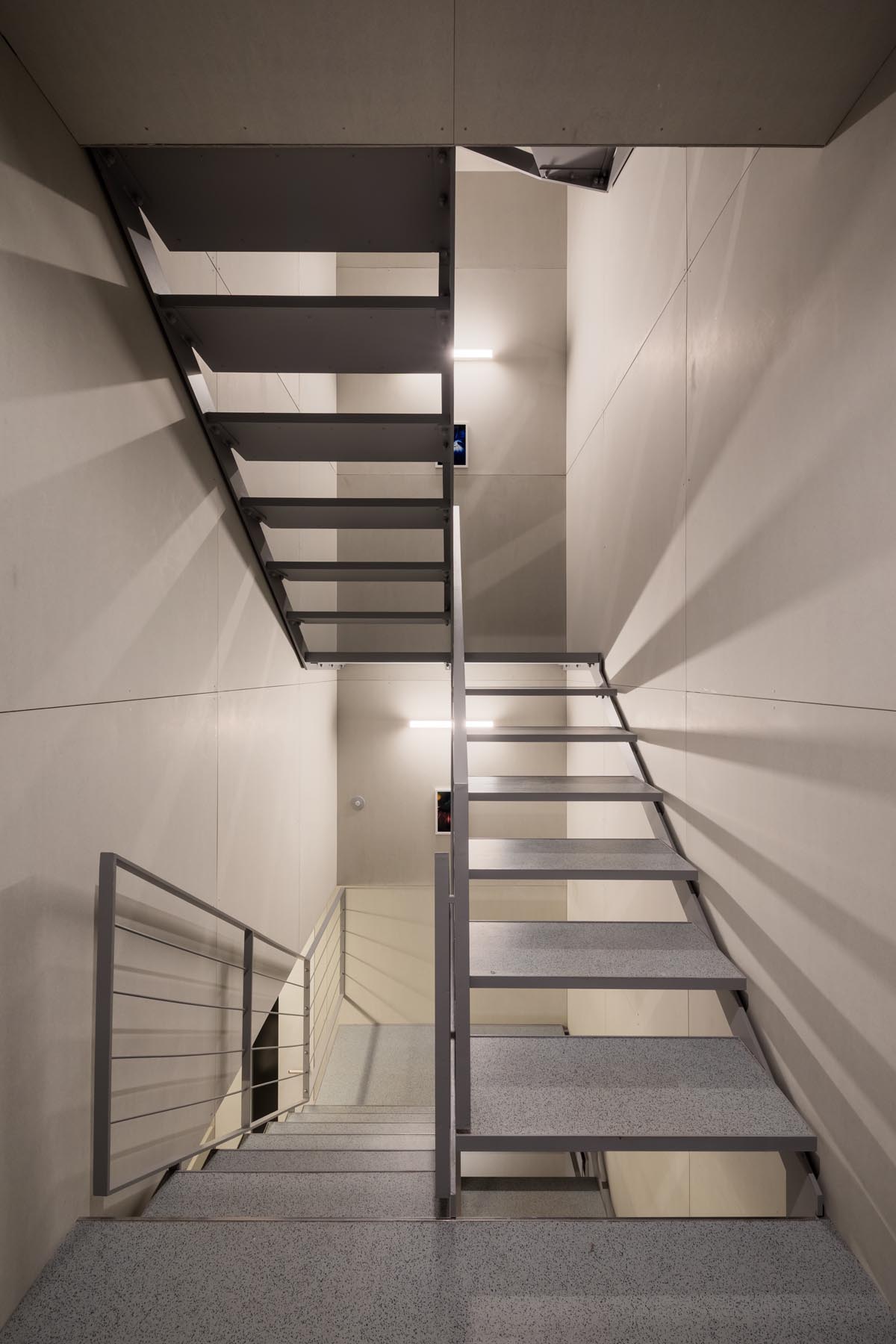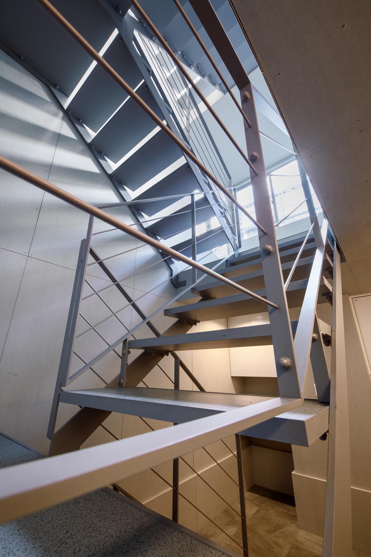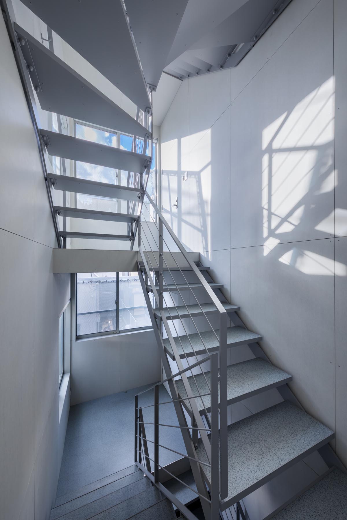 急こう配の屋根の下は、屋根裏部屋のような個室や、リビングの本棚となり、その急こう配の屋根が延長するように、屋上のペントハウスへとつないだ外観とした。周囲は事務所ビルも多く、3F以上の建物も多かったため、なるべく高さを出すことで周辺の建物に埋もれないように配慮した。