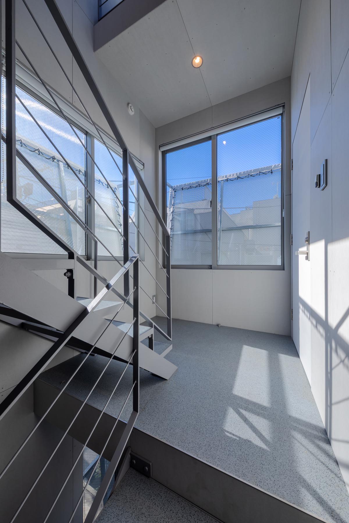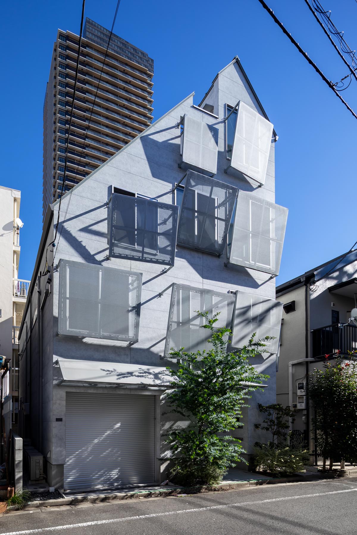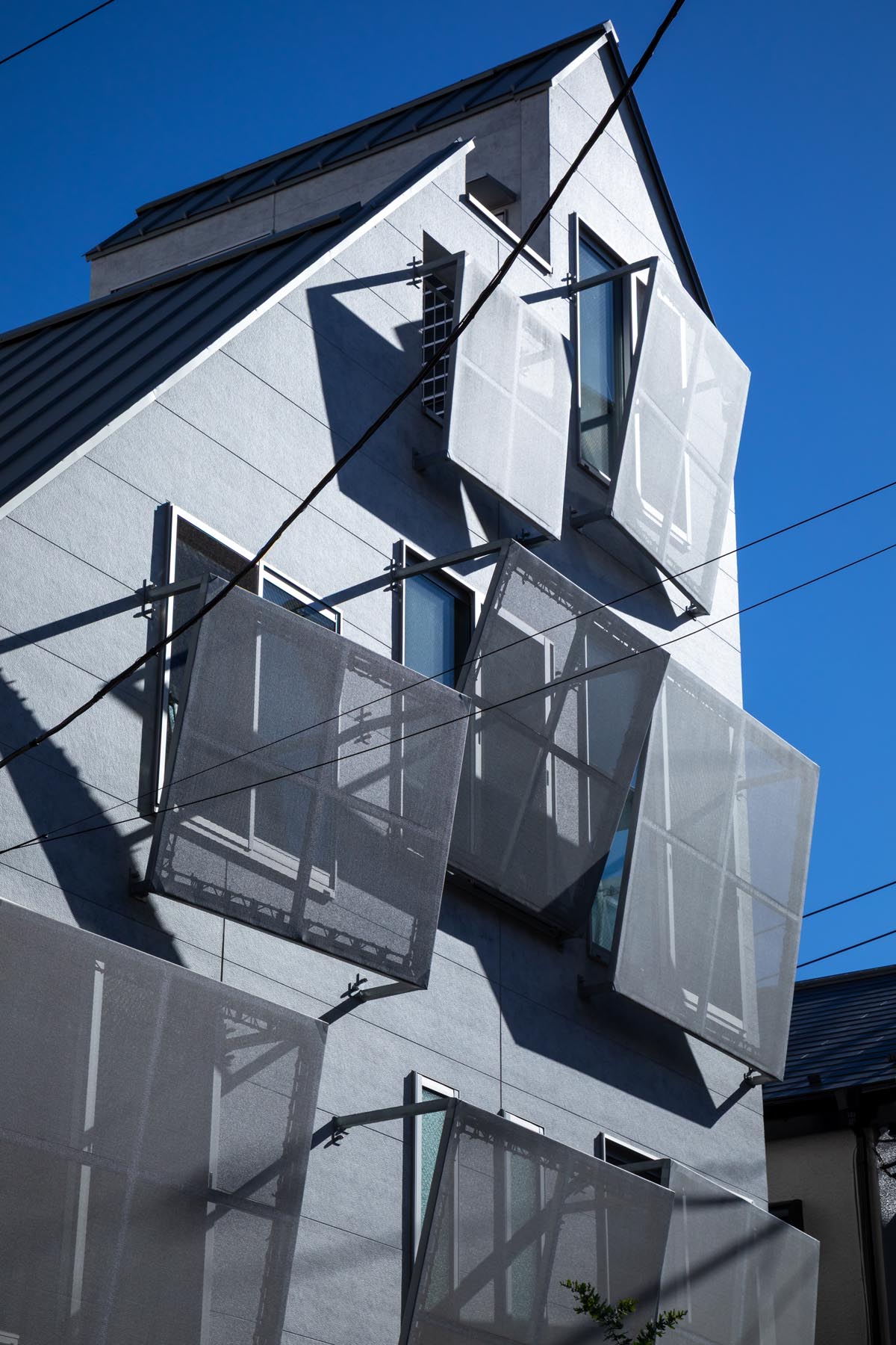 他方で、窓の外側にもう一層の膜があることで、視線を遮りつつ、日射も遮り、窓を開けても心理的な安心感をつうく効果を期待した。実際に、使っている施主からは、守られている感覚があると感想をいただいた。あまり見かけない外観であるが、半分商業的な用途が混じる新宿という立地を考えると、都心の住宅といてはこうした形が逆に馴染むように感じた。