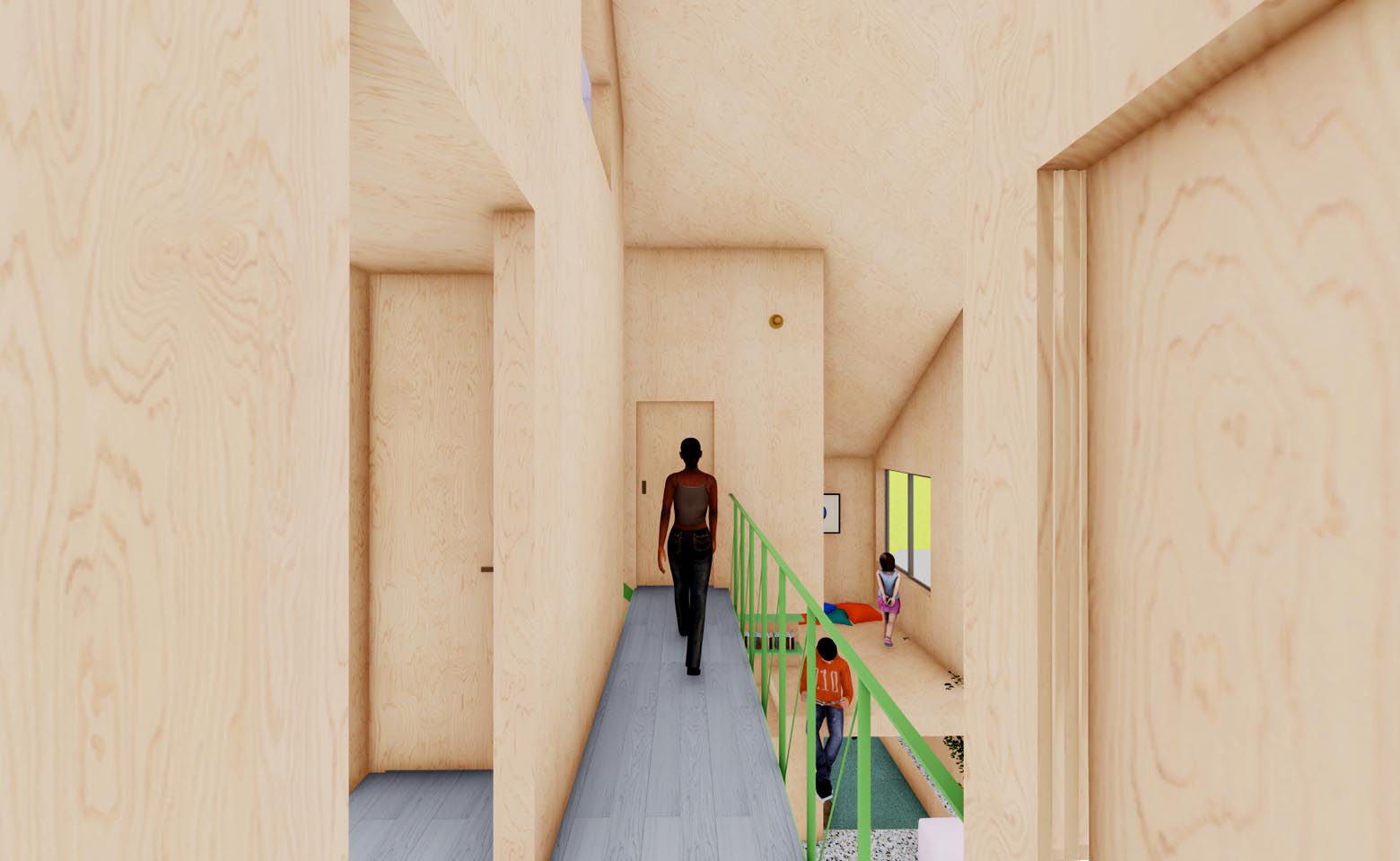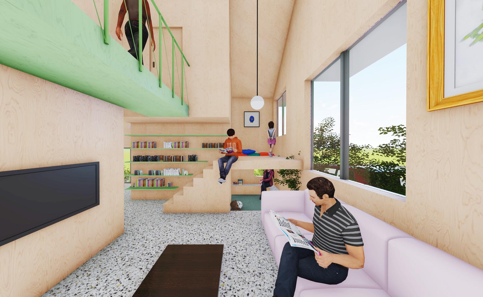 約40坪程度の延べ面積に、各個室と階段で使えるロフトを設ける。プランは、軒高を抑えた三角屋根の中に、ツリーハウスのような個室棟が距離をとりながら散らばっているもの。