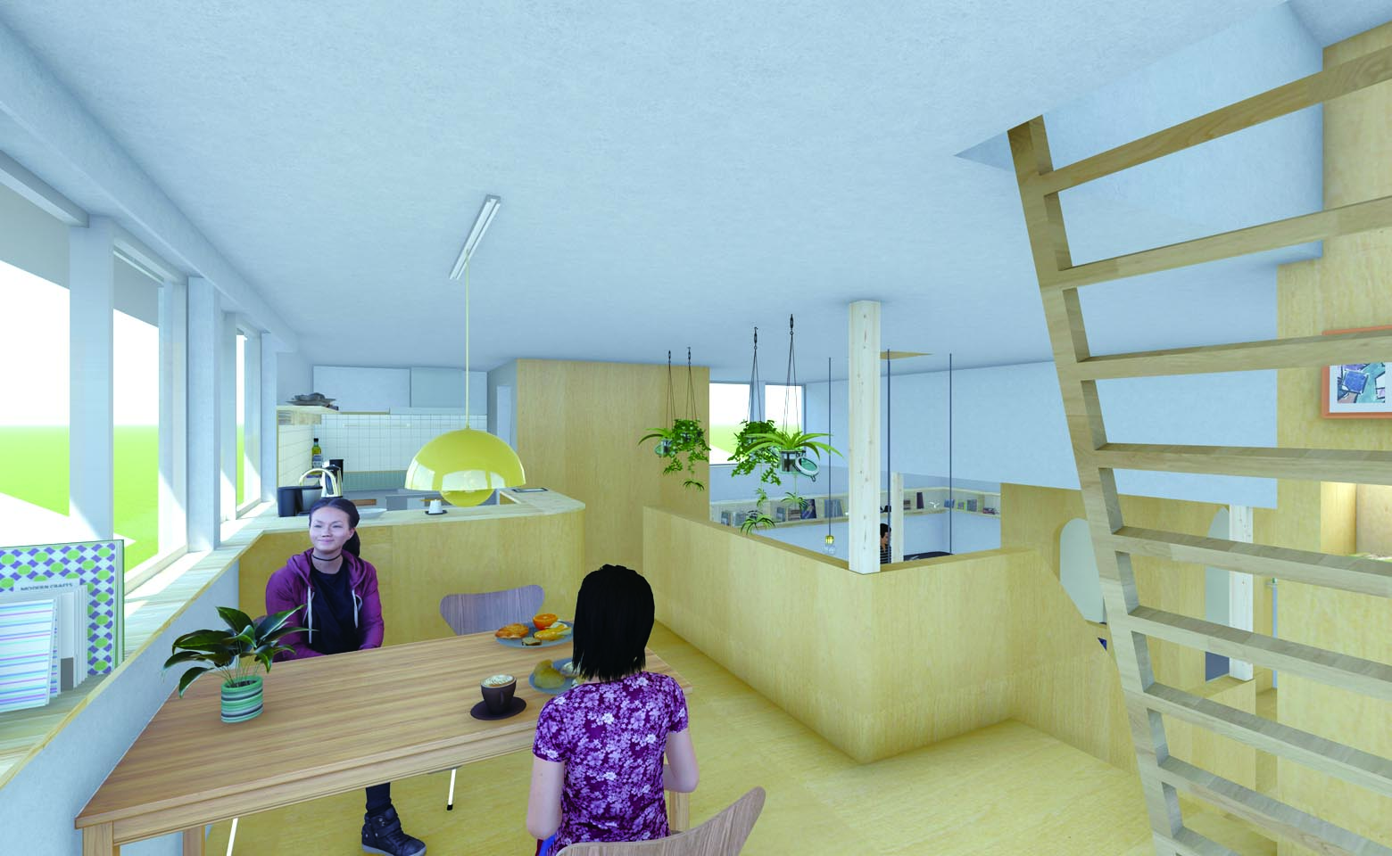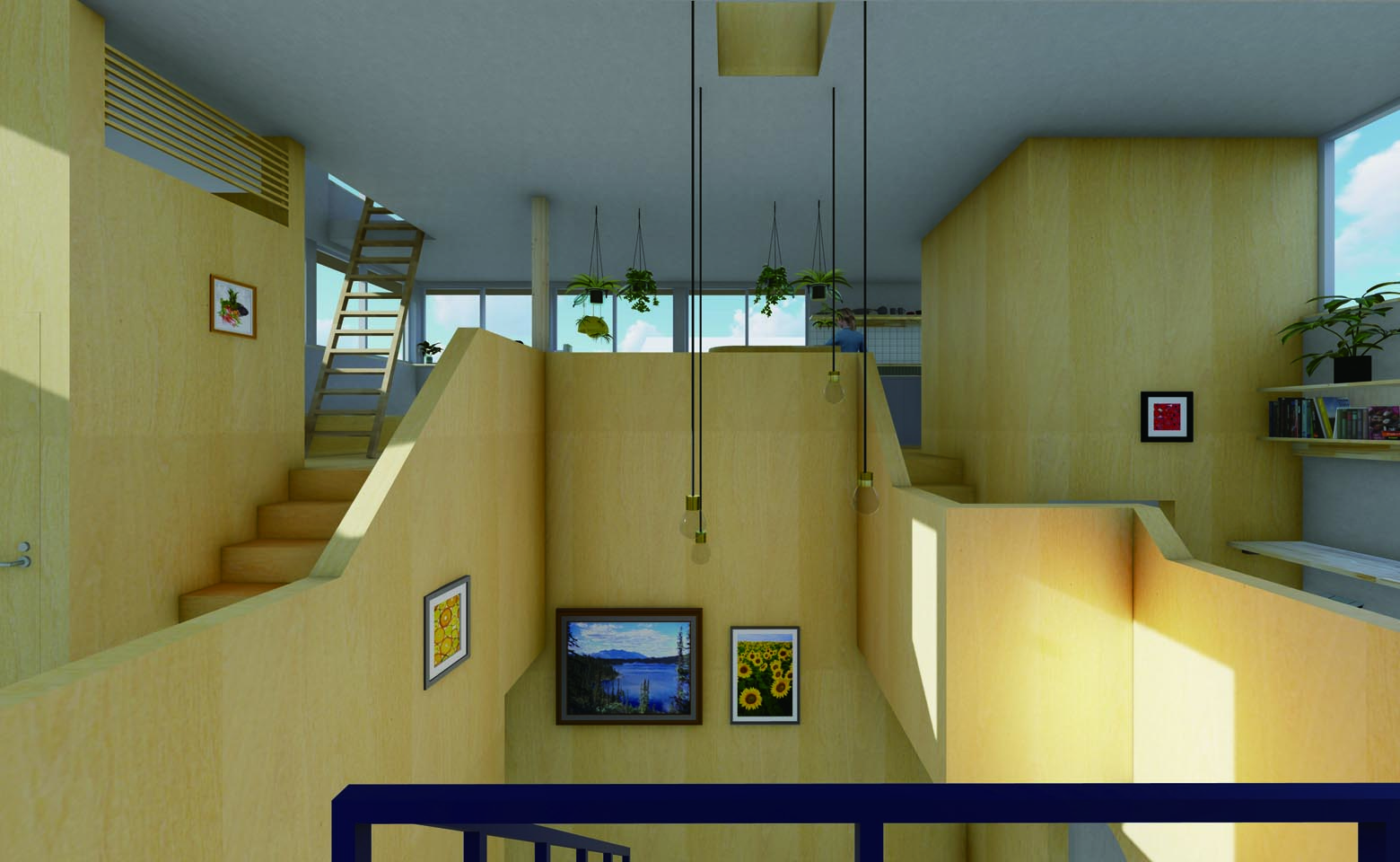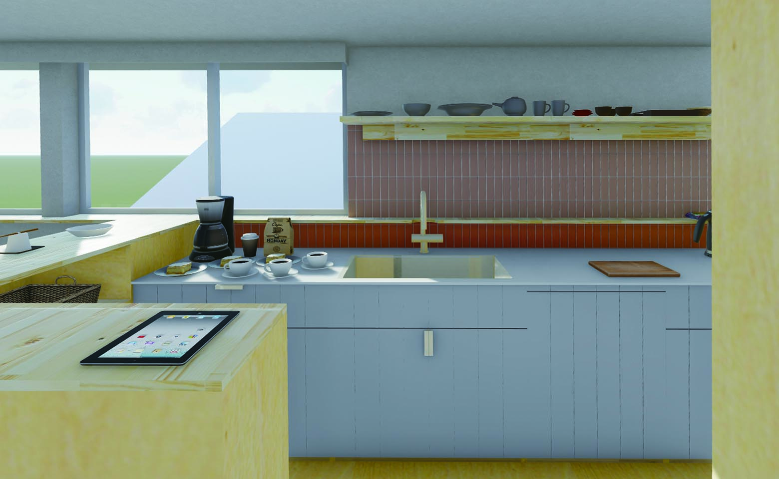 今日のライフスタイルは多様で、従来のnLDK的な個室とリビングダイニングという二元的な機能分割では、そこに住む家族の活動を包括することができていないのではないだろうか、という疑問から、ここでは、大きなワンルーム状の空間と、小さな住まいにまつわる機能を、使い方を定義しすぎない空間的な起伏により解決することで、住まいの多様性や活動の振れ幅を受容できる、新しい住まいの形式を考えている。