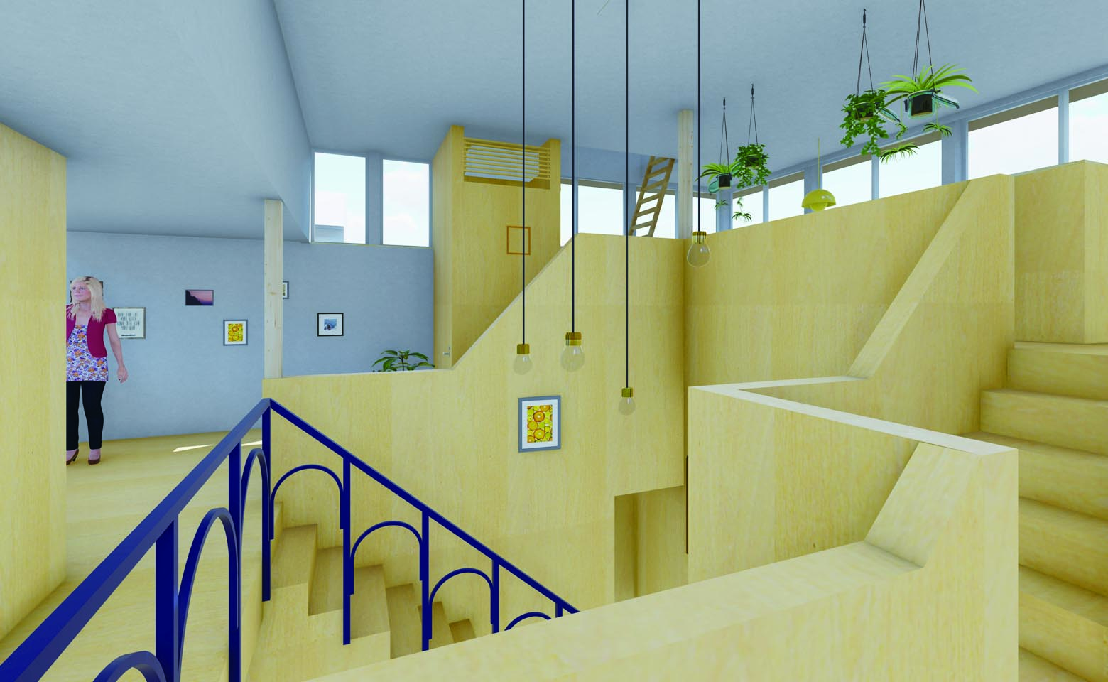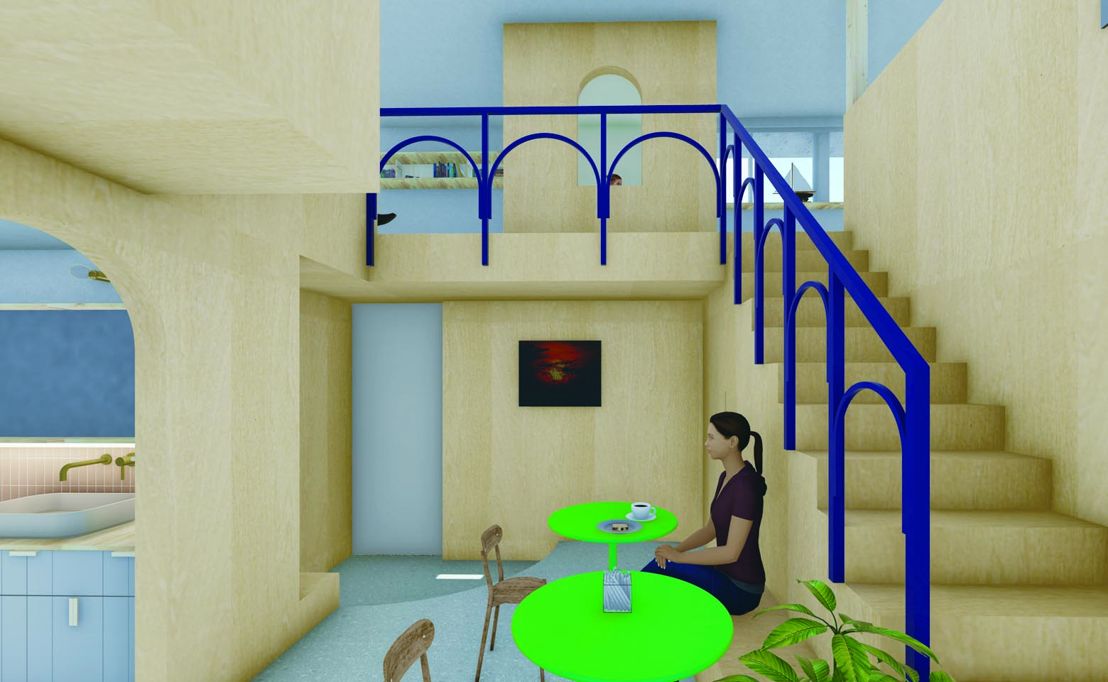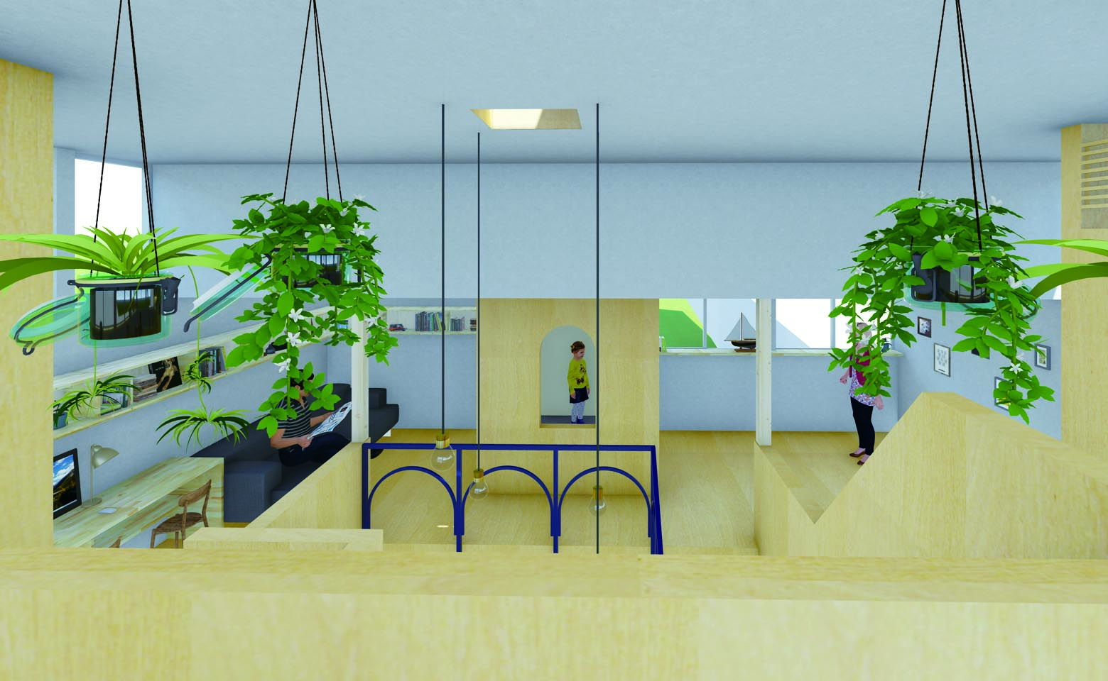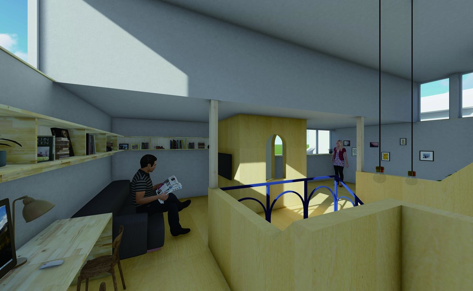 今日のライフスタイルは多様で、従来のnLDK的な個室とリビングダイニングという二元的な機能分割では、そこに住む家族の活動を包括することができていないのではないだろうか、という疑問から、ここでは、大きなワンルーム状の空間と、小さな住まいにまつわる機能を、使い方を定義しすぎない空間的な起伏により解決することで、住まいの多様性や活動の振れ幅を受容できる、新しい住まいの形式を考えている。